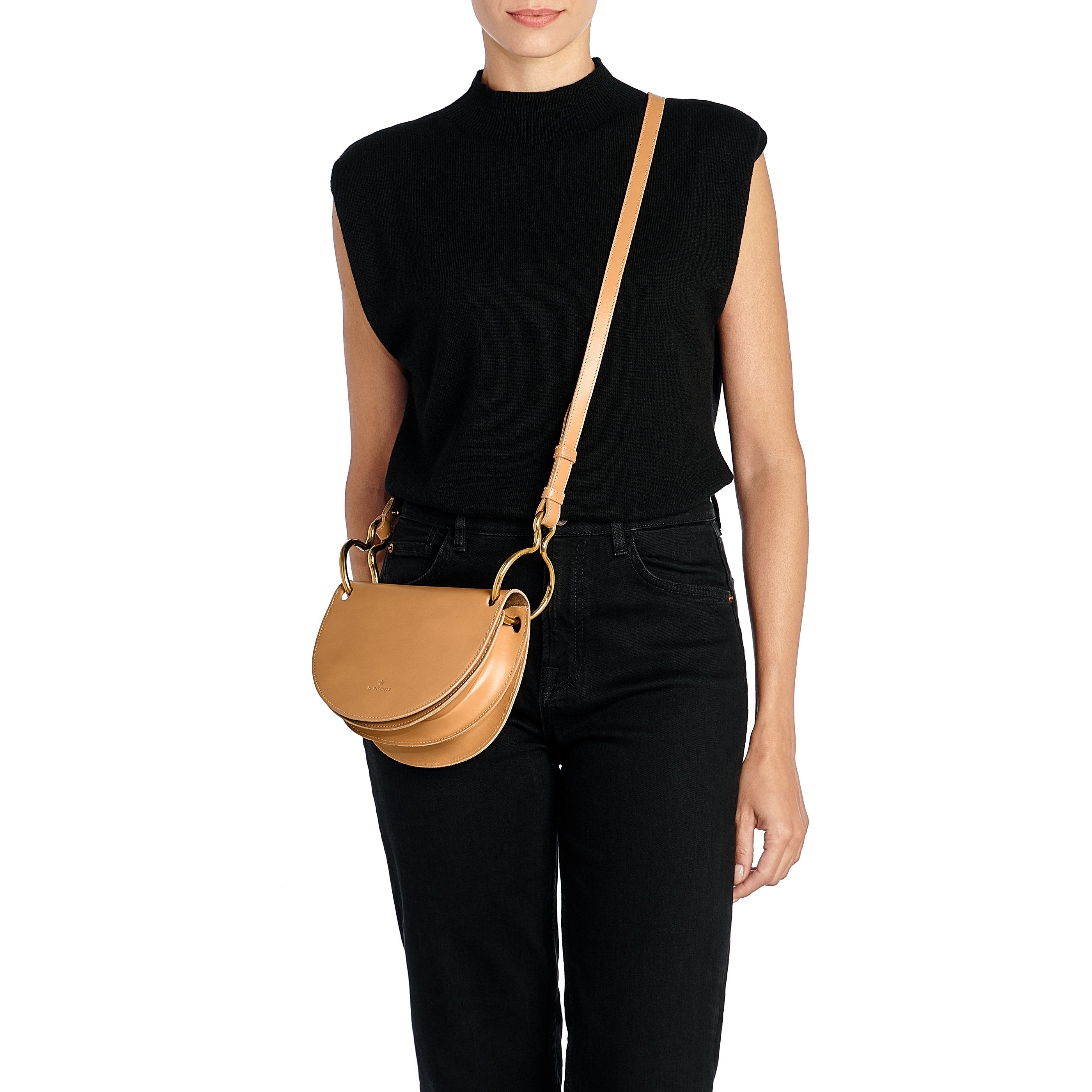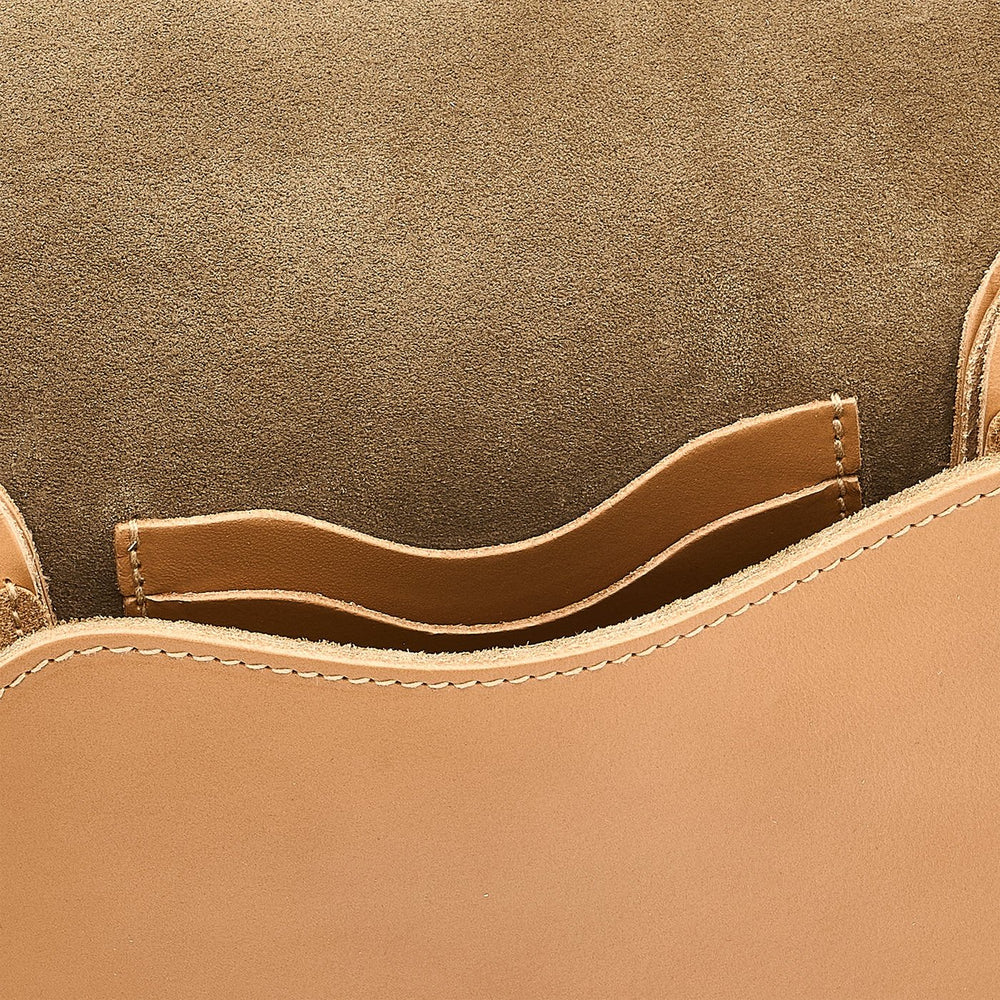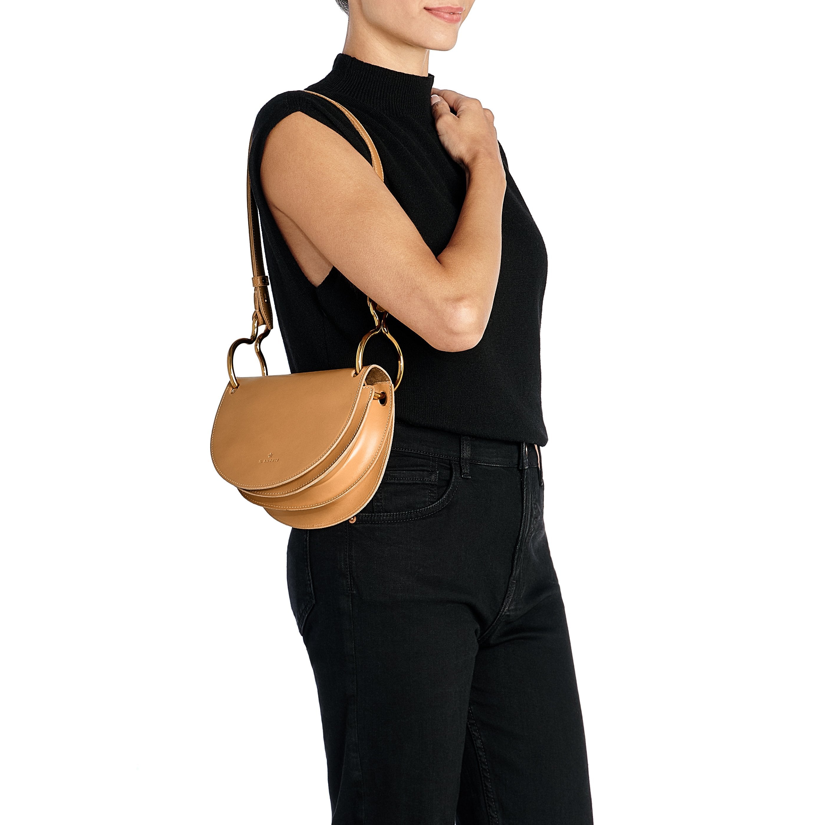 Borsa da donna in pelle di vacchetta conciata al vegetale con grandi anelli-gioiello in ottone, patta e tracolla regolabile. Made in Italy.Si indossa cross-body o a spalla regolando la lunghezza della tracolla con gemelli di ottone. Chiusura sotto-patta con bottone magnetico. Apertura a soffietto. L'interno, foderato in suede, ospita una doppia taschina aperta per carte di credito e documenti.