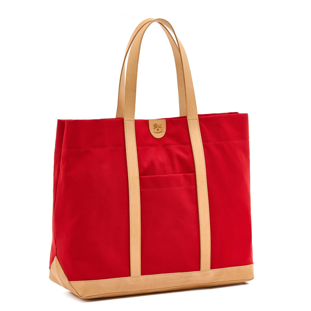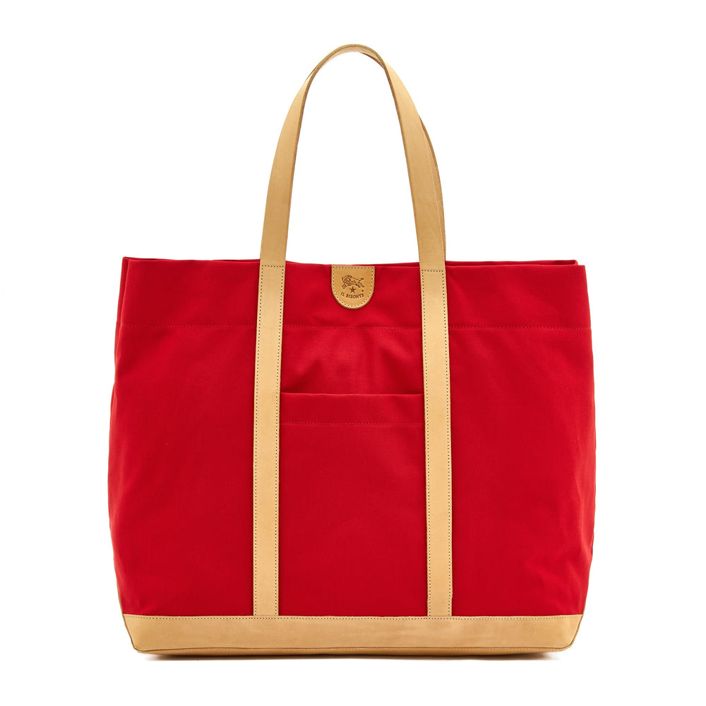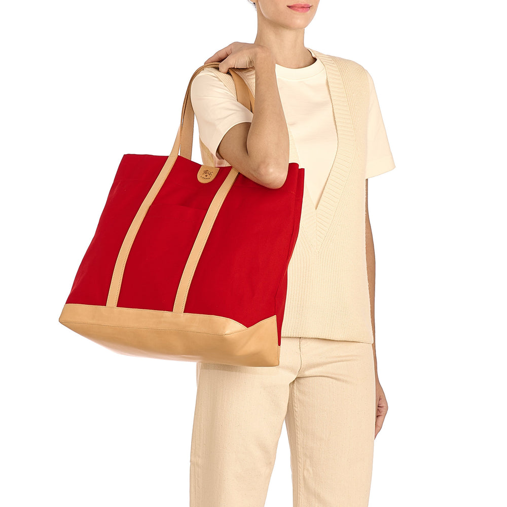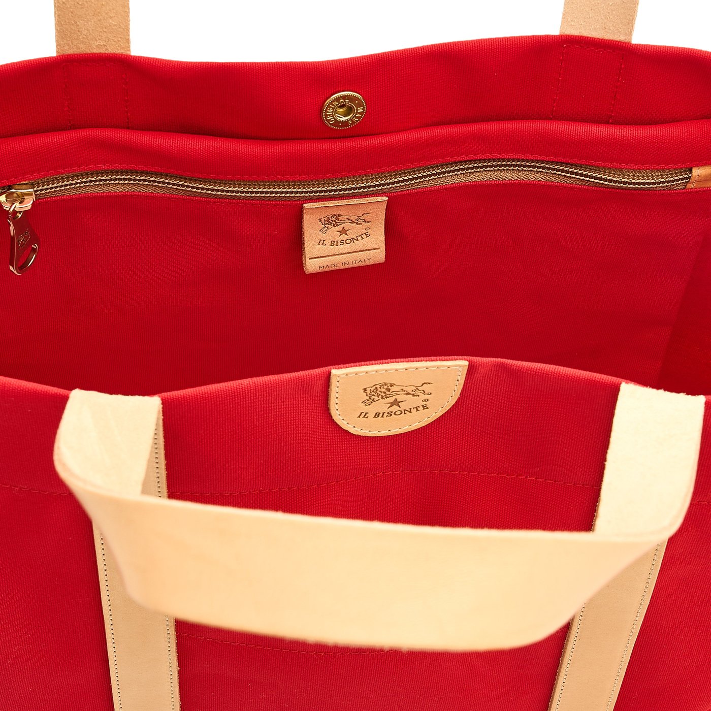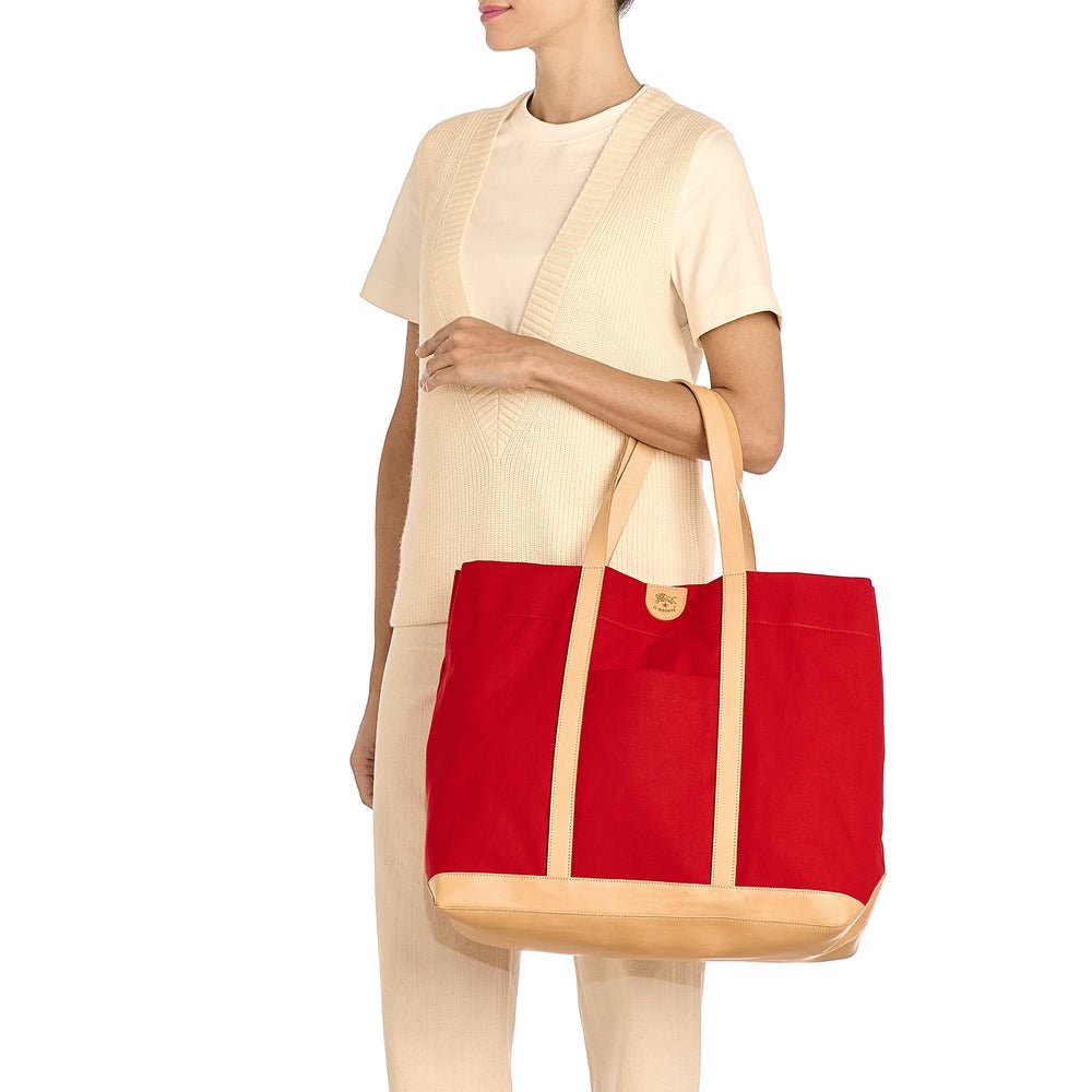 Borsa a spalla in tela di cotone, indossabile anche a mano. Profili, manici e base in pelle strutturata conciata al vegetale. Tasca esterna aperta. All'interno, tasca con zip removibile e indossabile come pouch. 100% made in Italy.