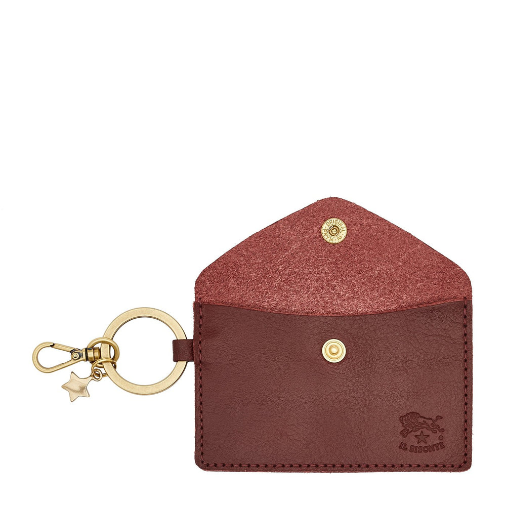 Portachiavi ad anello da donna con stellina decorativa in ottone e bustina portacarte in pelle di vacchetta conciata al vegetale. Prodotto in Italia dai maestri artigiani della filiera a km 30 de Il Bisonte. Anello, moschettone e stellina di ottone finitura oro. Bustina in pelle con chiusura con bottone automatico e interno sfoderato.