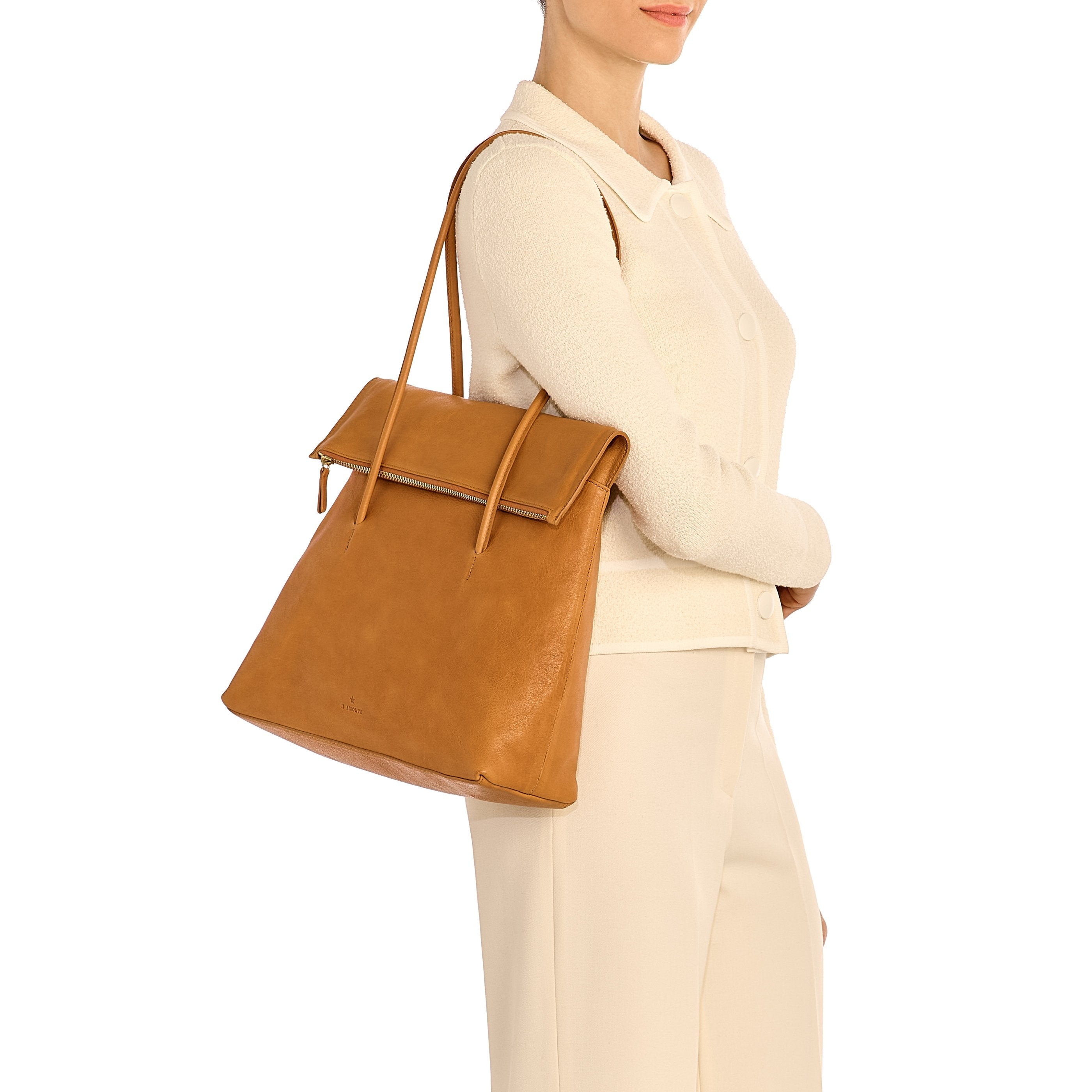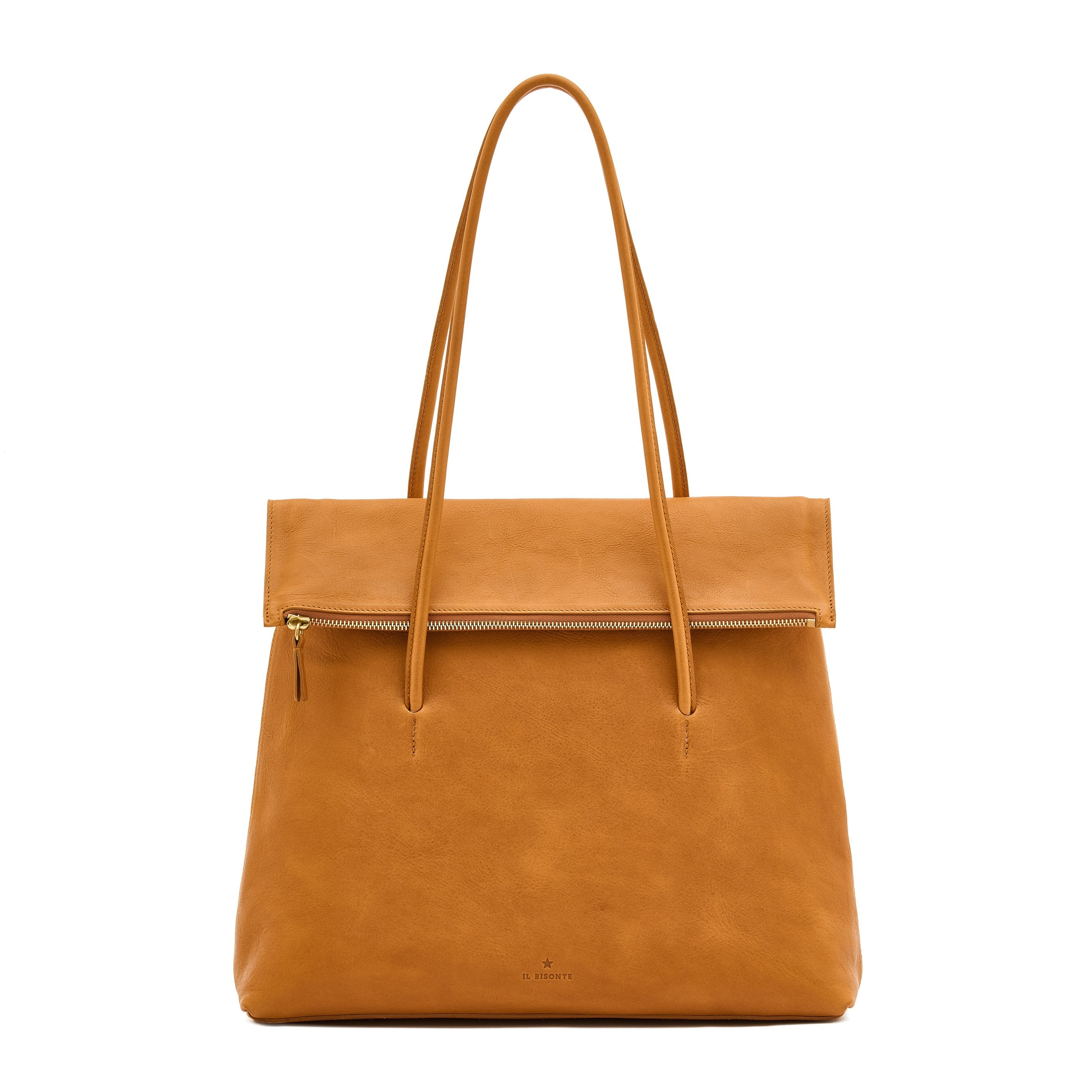 Tote bag in pelle vintage conciata al vegetale. Il suo design essenziale è reso inconfondibile dalla patta che ricade sul corpo della borsa. Chiusura con zip con tiralampo in pelle. Comoda tasca sottopatta aperta, foderata in tela di cotone. L'interno, foderato in tela di cotone, è dotato di una tasca con zip. 100% made in Italy.
