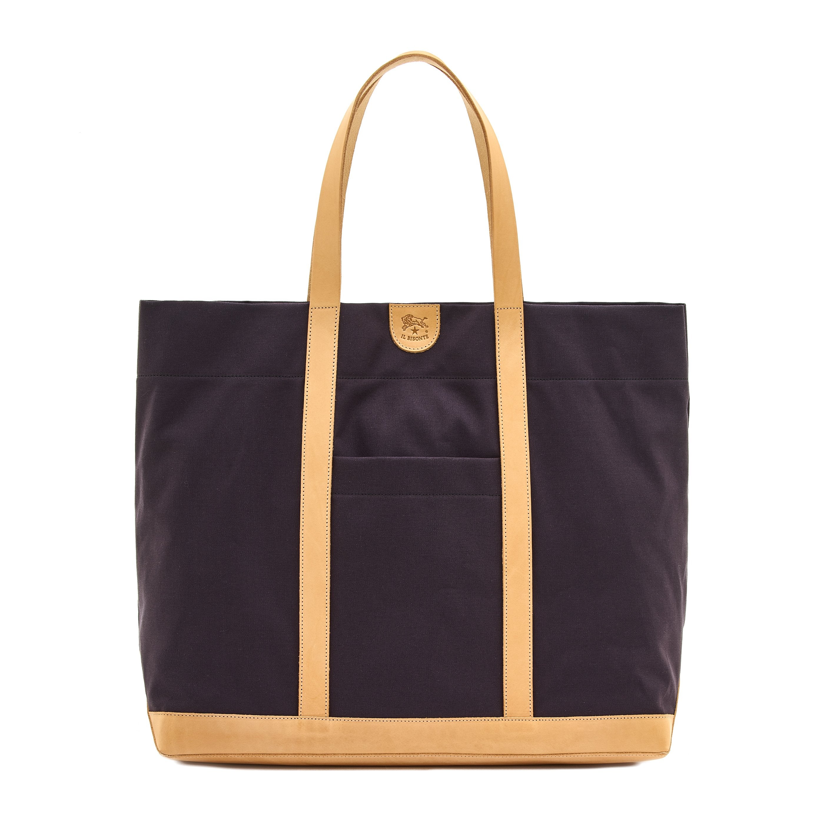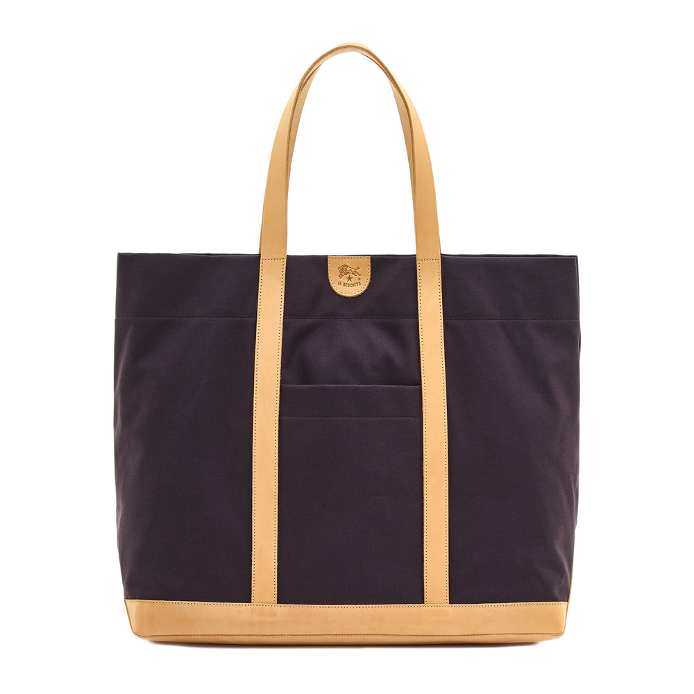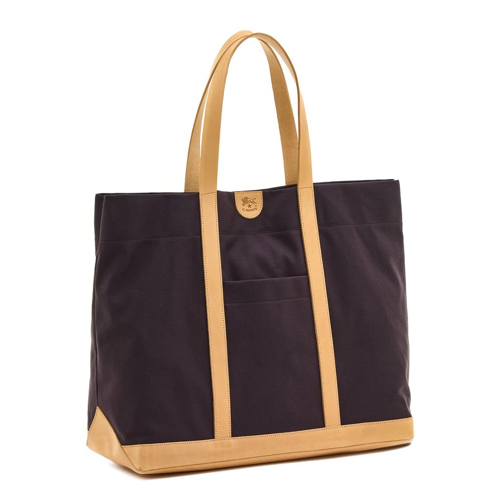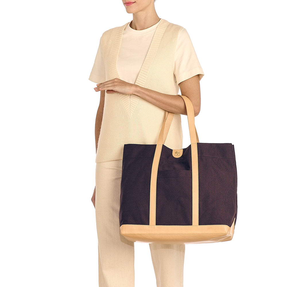Borsa a spalla in tela di cotone, indossabile anche a mano. Profili, manici e base in pelle strutturata conciata al vegetale. Tasca esterna aperta. All'interno, tasca con zip removibile e indossabile come pouch. 100% made in Italy.