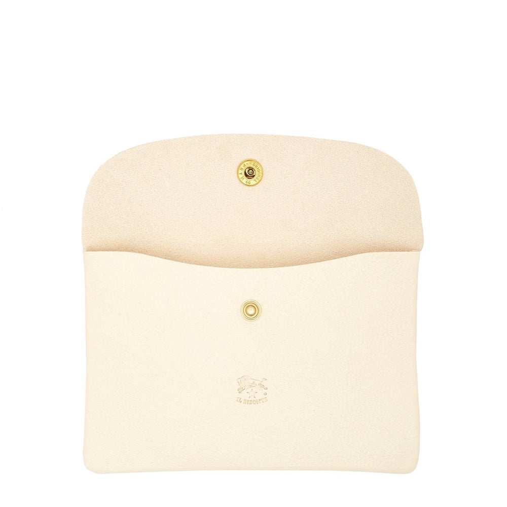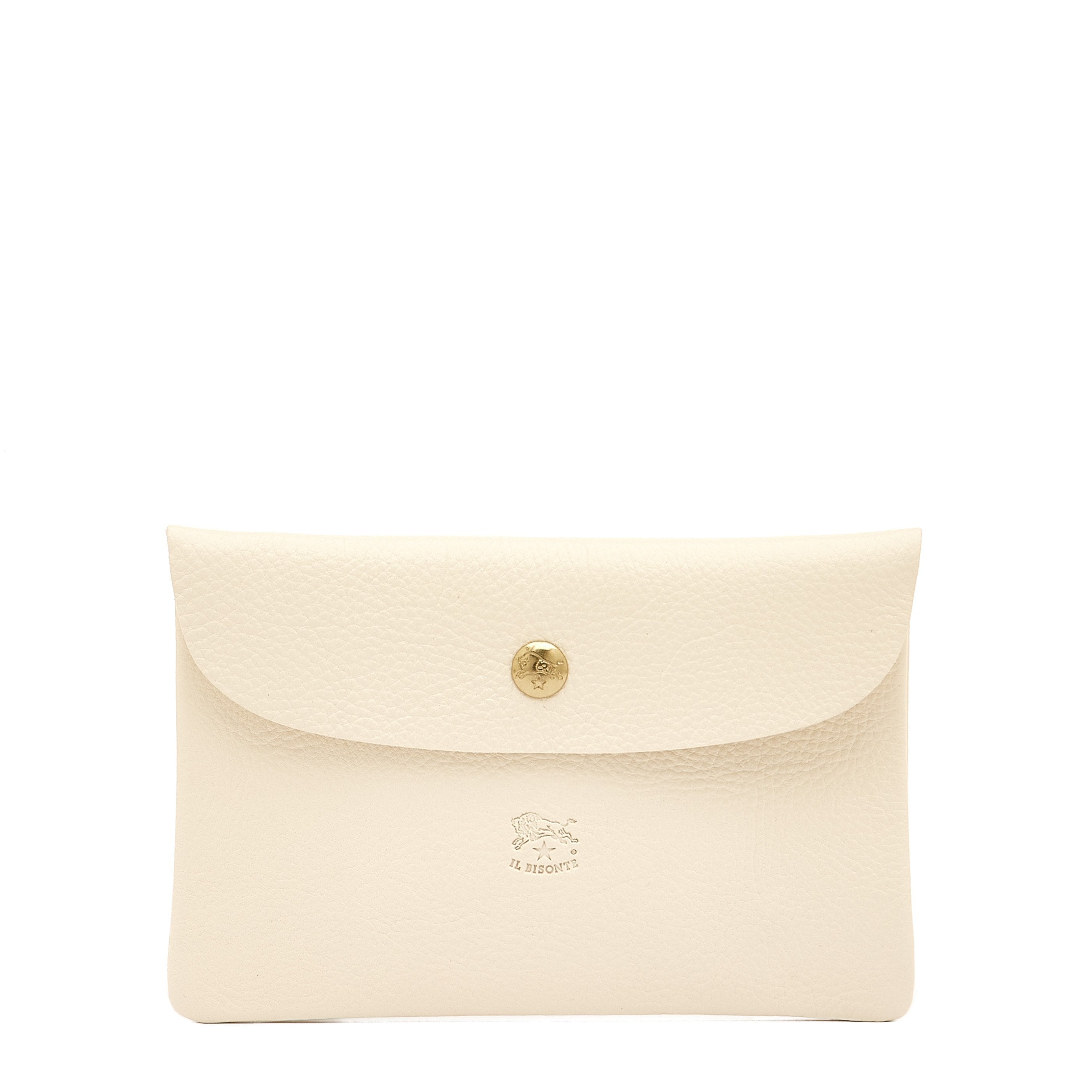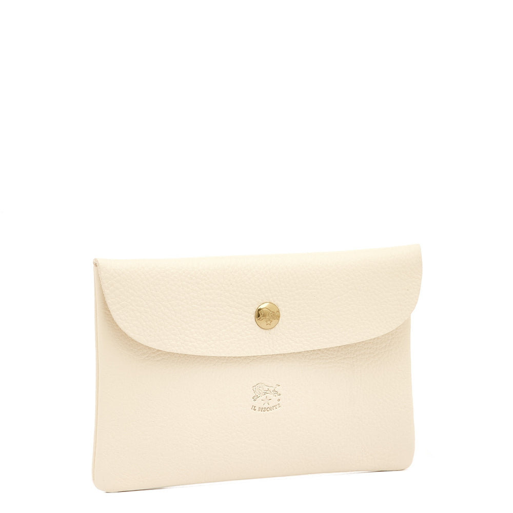 Bustina unisex in pelle di vacchetta conciata al vegetale. Prodotta in Italia dai maestri artigiani della filiera a km 30 de Il Bisonte. Chiusura con bottone automatico a vista di ottone, finitura oro. Interno sfoderato.