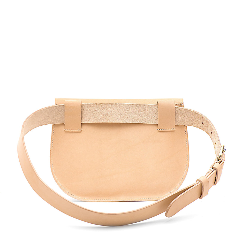Piccolo marsupio da donna in pelle di vacchetta conciata al vegetale, con cintura giro-vita regolabile e removibile. Prodotto in Italia dai maestri artigiani della filiera a km 30 de Il Bisonte. La lunghezza della cintura si regola con una fibbia di ottone. Interno sfoderato.