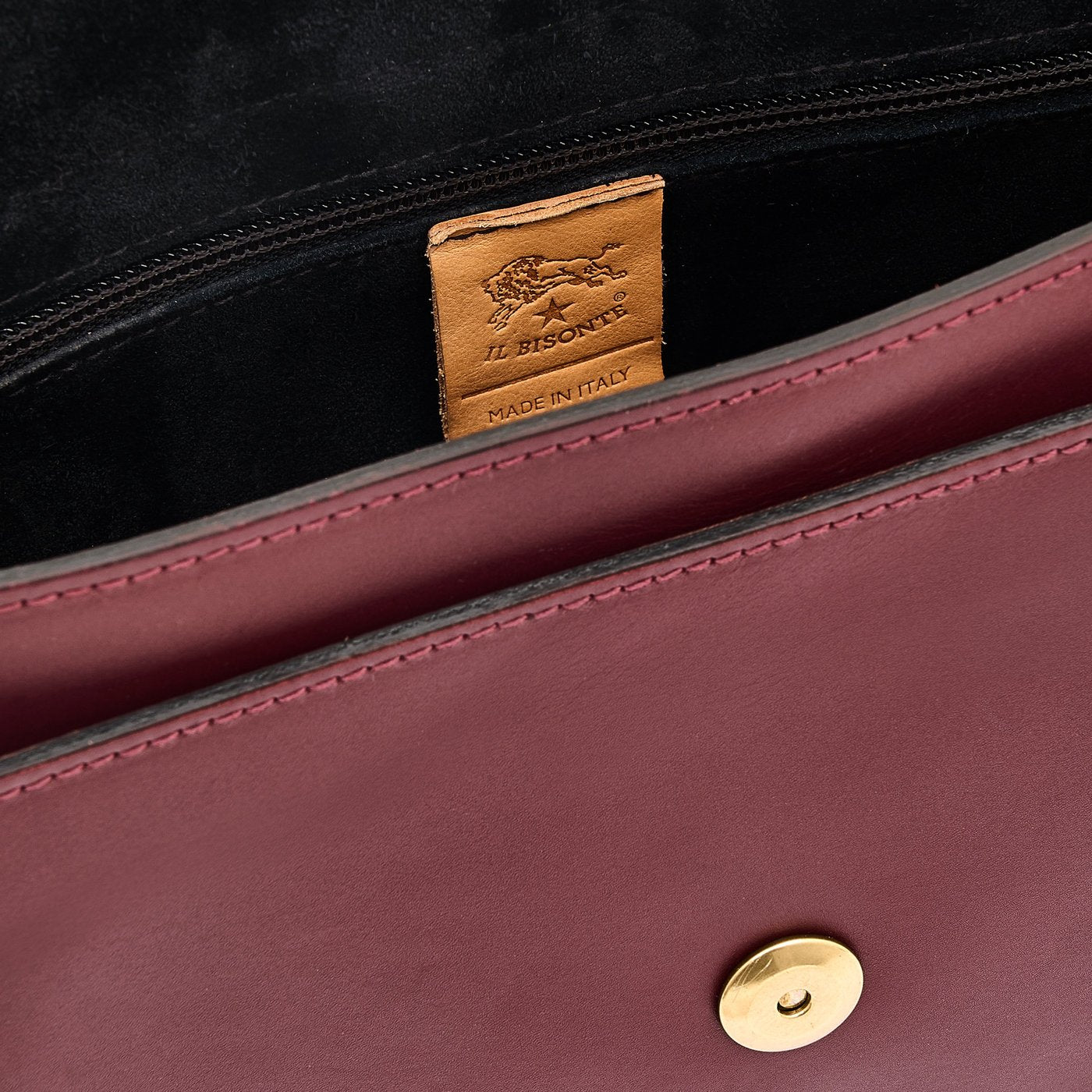 Borsa a tracolla da donna in pelle di vacchetta conciata al vegetale, con patta a chiusura magnetica. Prodotta in Italia dai maestri artigiani della filiera a km 30 de Il Bisonte. Tracolla regolabile. Sotto-patta in suede. L'interno, sfoderato, ospita due ampi scomparti e una tasca in suede con chiusura a zip e tiralampo di ottone.