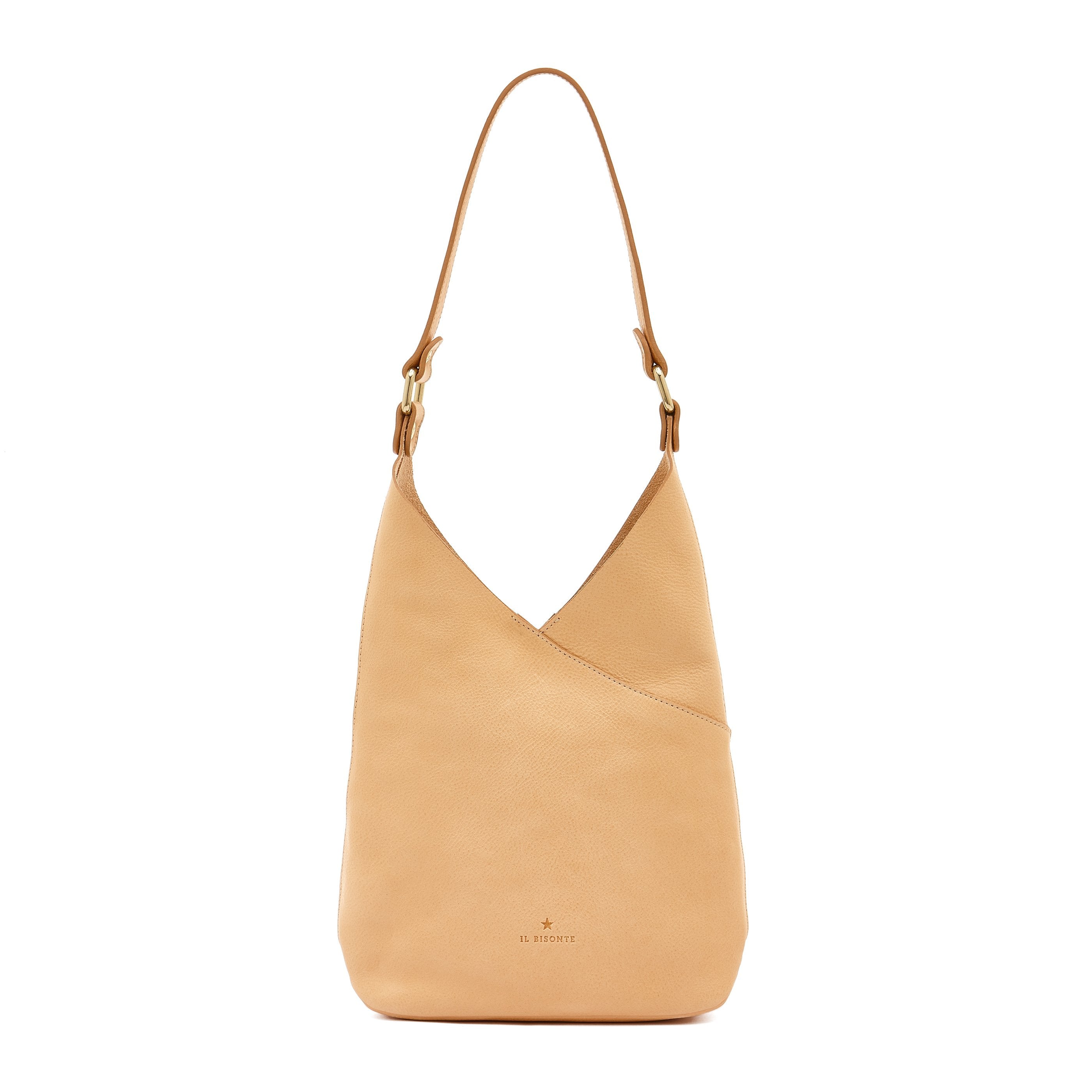 Piccola borsa a spalla da donna in morbida pelle conciata al vegetale. Leggera ed essenziale, si chiude con un bottone automatico e ha l'interno sfoderato. 100% made in Italy, è prodotta in provincia di Firenze dai maestri artigiani della filiera a KM30 de Il Bisonte.
