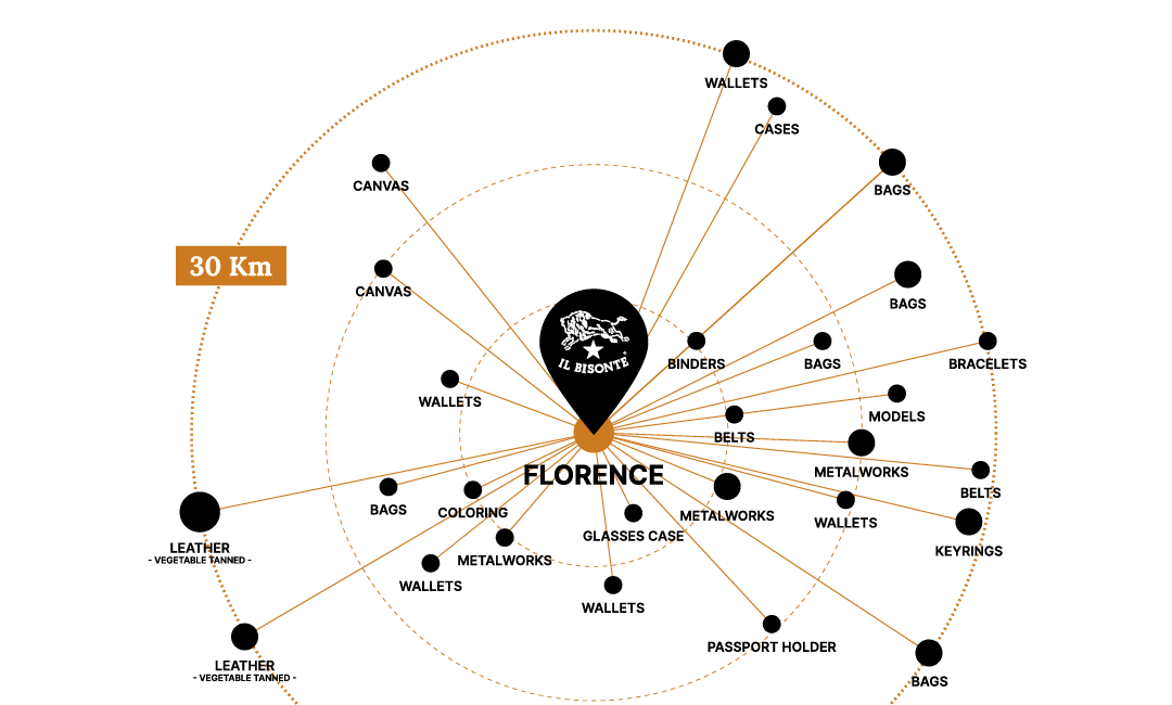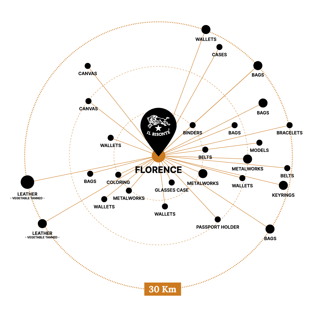 Come le prime creazioni de Il Bisonte, nate nel centro storico di Firenze 55 anni fa, tutte le borse e la piccola pelletteria sono prodotte nei laboratori artigianali della filiera del brand, concentrati in un raggio di 30 km dalla sua sede di Firenze.