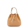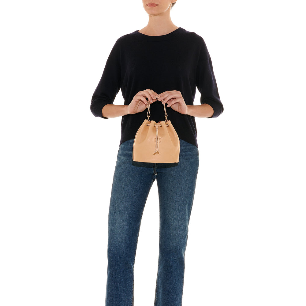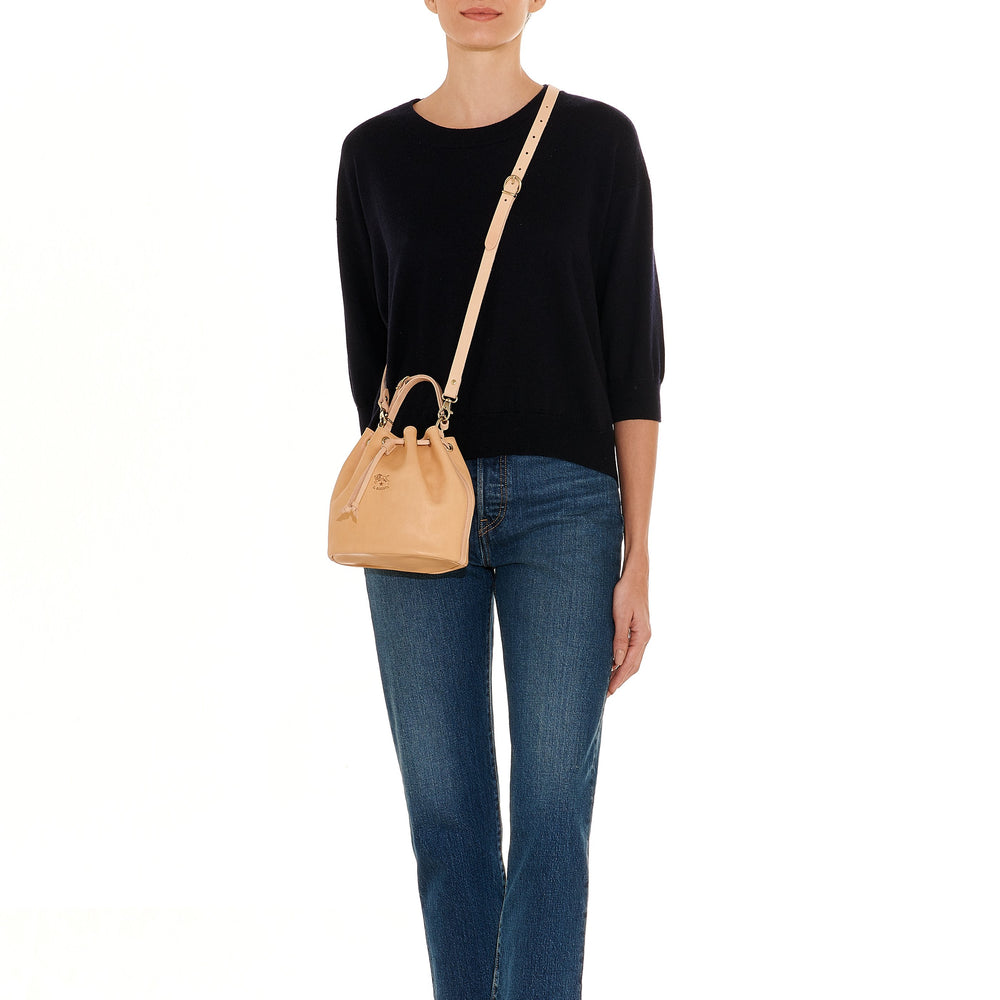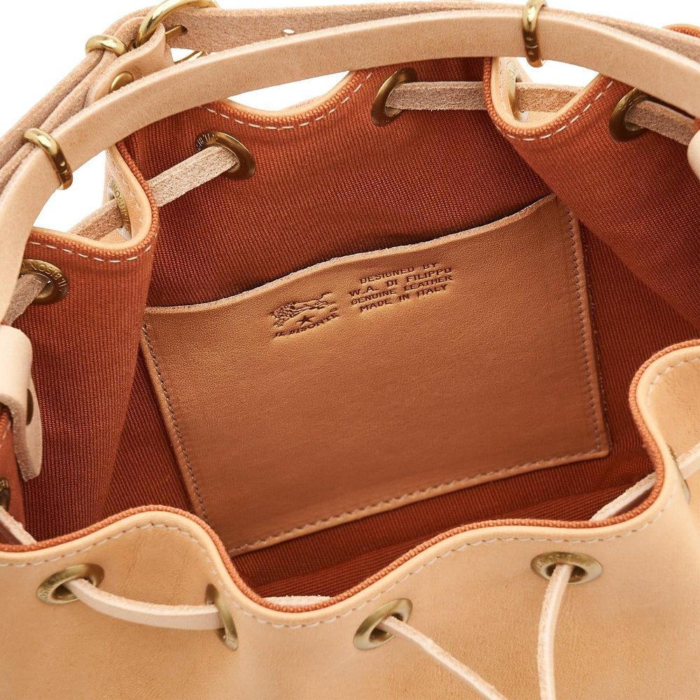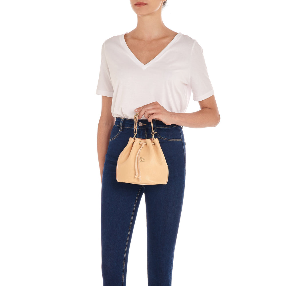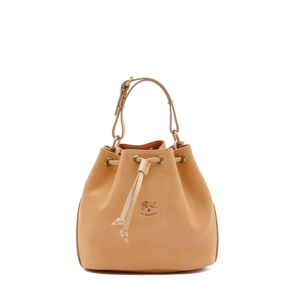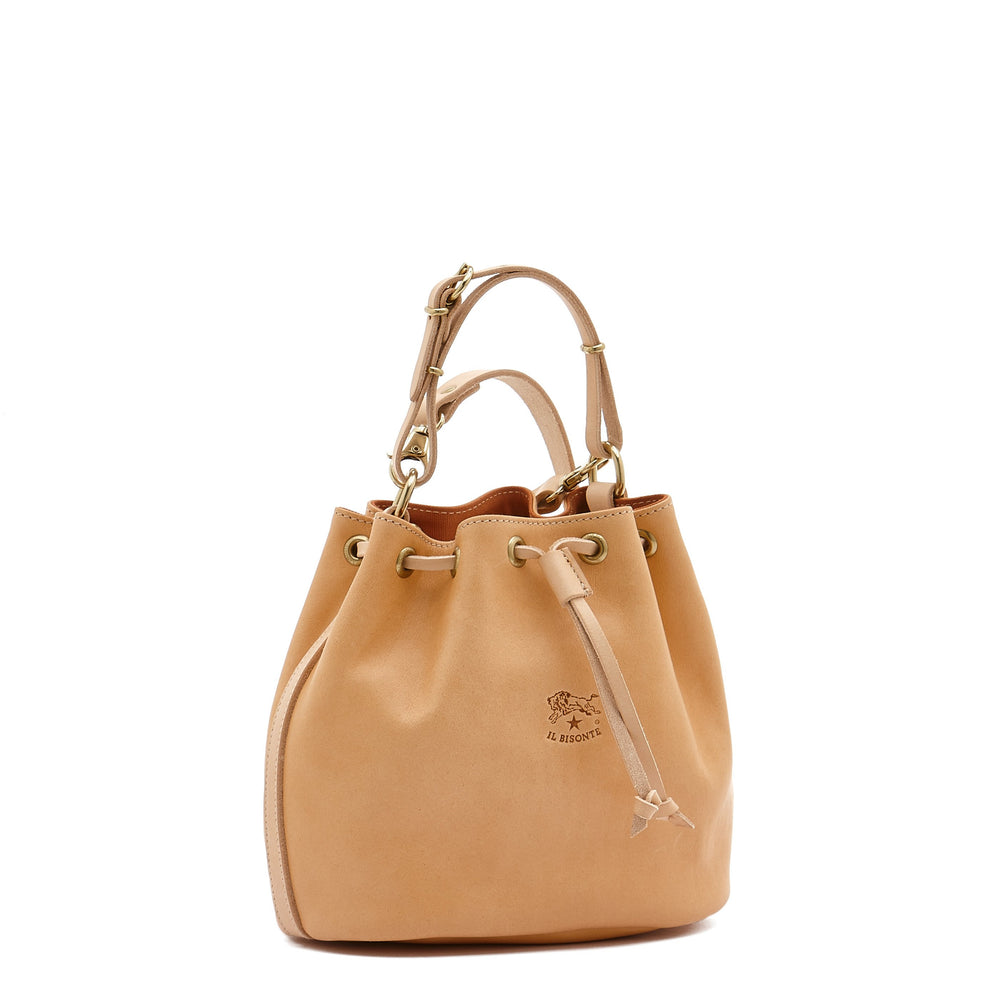 Secchiello da donna in pelle di vacchetta conciata al vegetale, con manico e tracolla regolabile e removibile. Prodotto in Italia dai maestri artigiani della filiera a km 30 de Il Bisonte. Manico regolabile e removibile con fibbia di ottone finitura oro. Tracolla regolabile con fibbia e removibile con moschettoni. Chiusura a coulisse con laccetto in pelle di vacchetta. L'interno, foderato in tela di cotone, ospita una piccola tasca aperta in pelle.