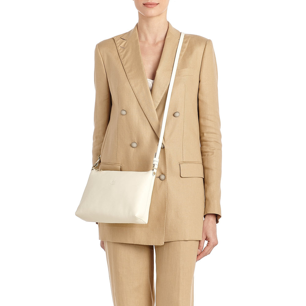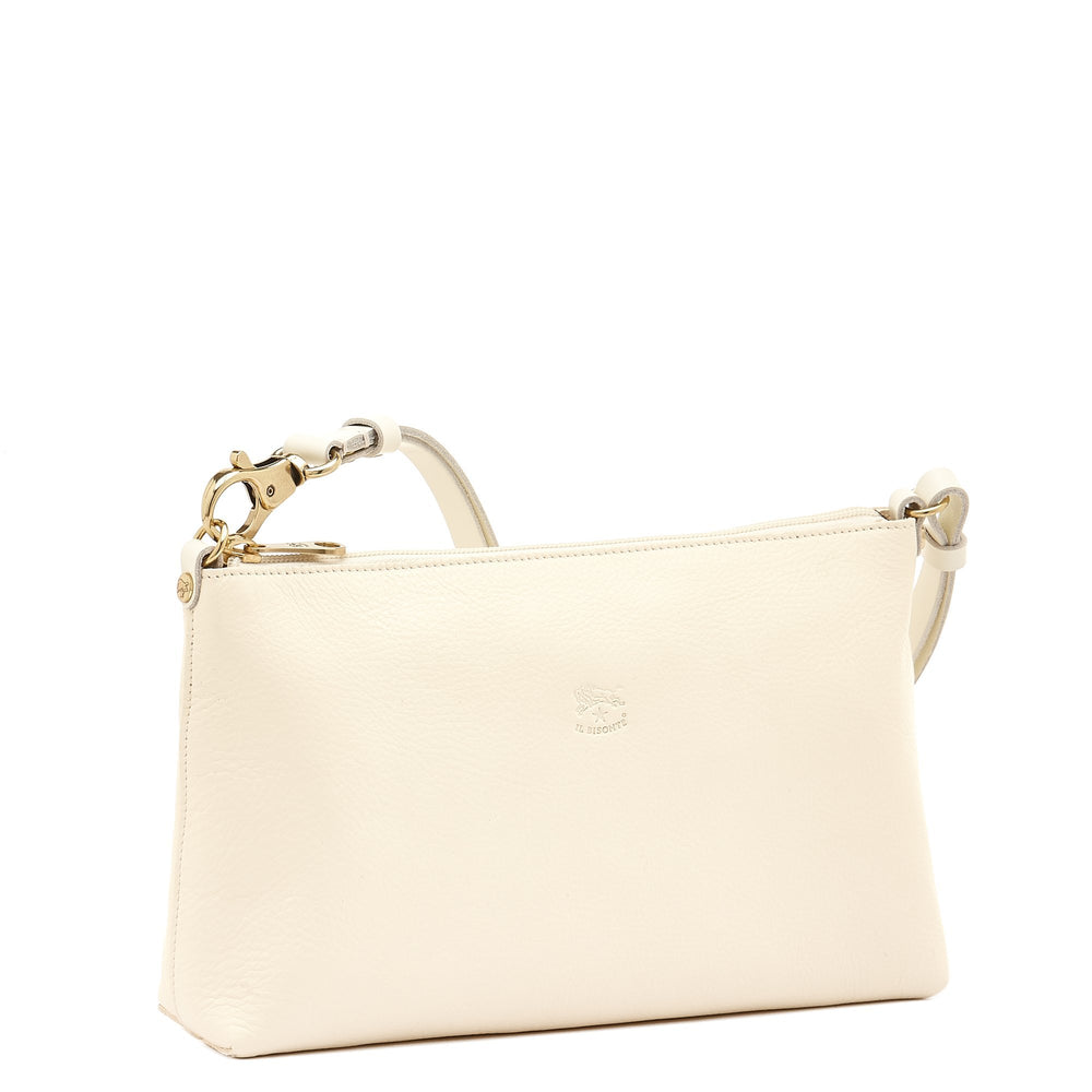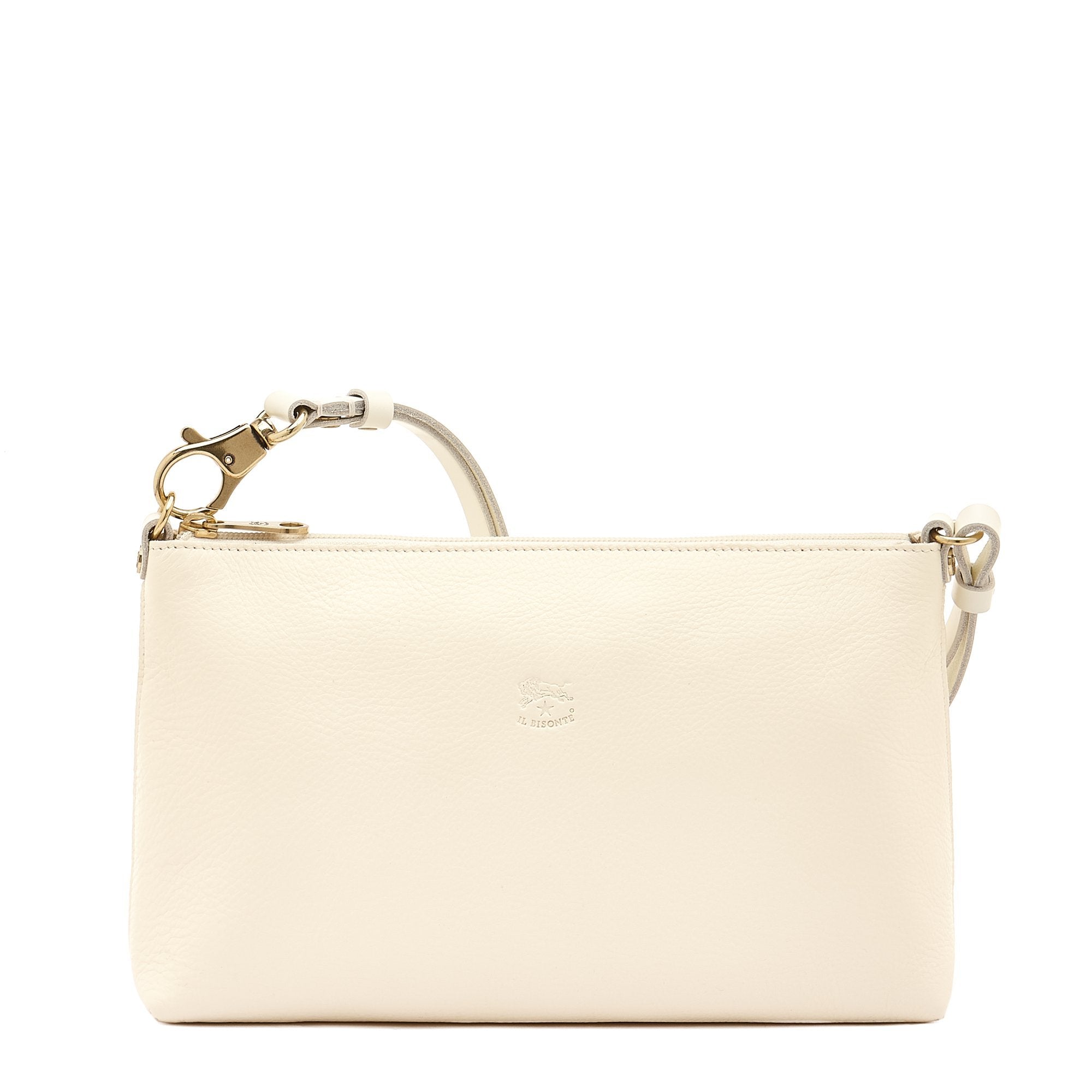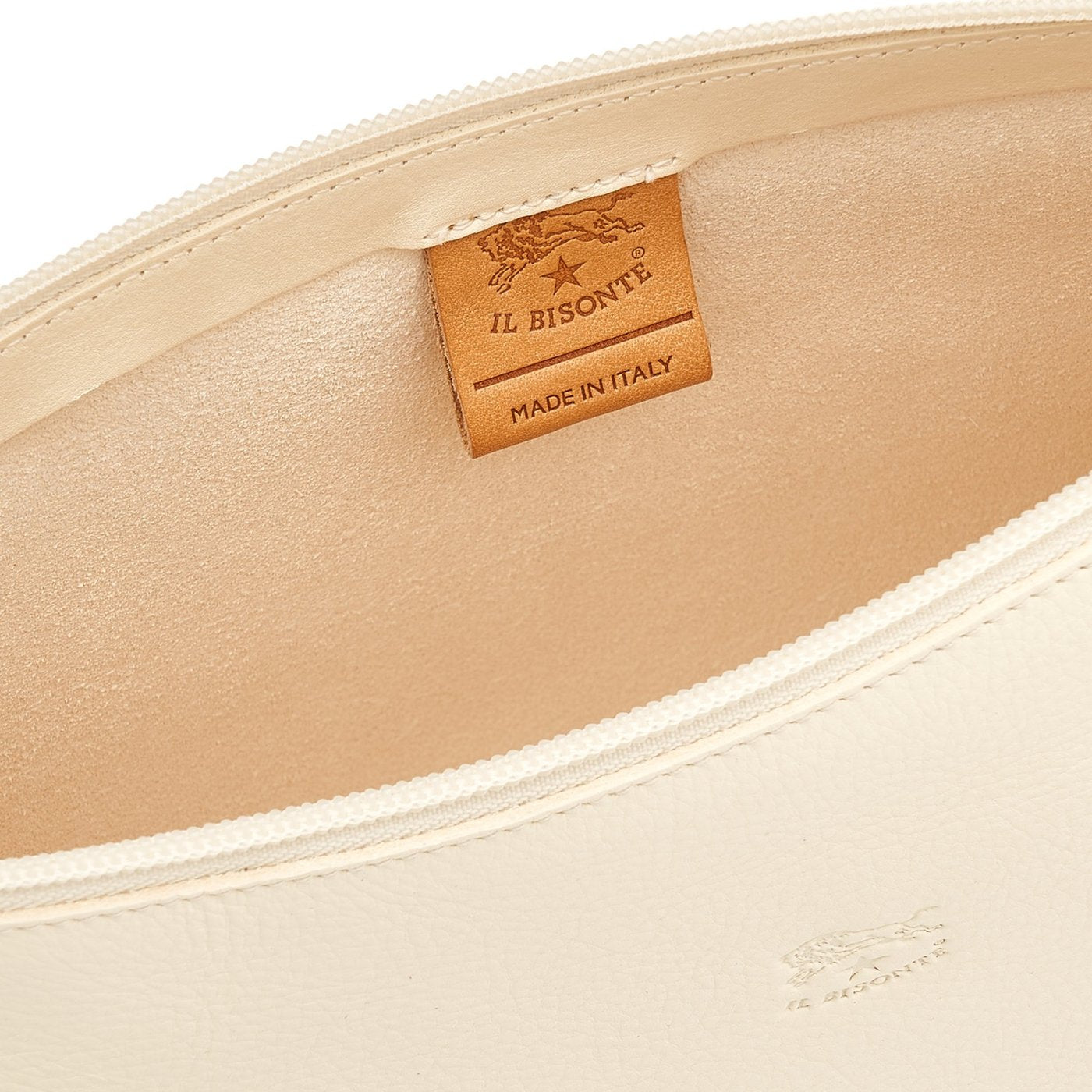 Borsa a spalla da donna in pelle di vacchetta conciata al vegetale, con tracolla regolabile. Prodotta in Italia dai maestri artigiani della filiera a km 30 de Il Bisonte. Tracolla agganciata al corpo della borsa con un moschettone e un anello di ottone finitura oro. La lunghezza della tracolla si regola con un bottone automatico. Chiusura con zip con tiralampo di ottone. Interno sfoderato.