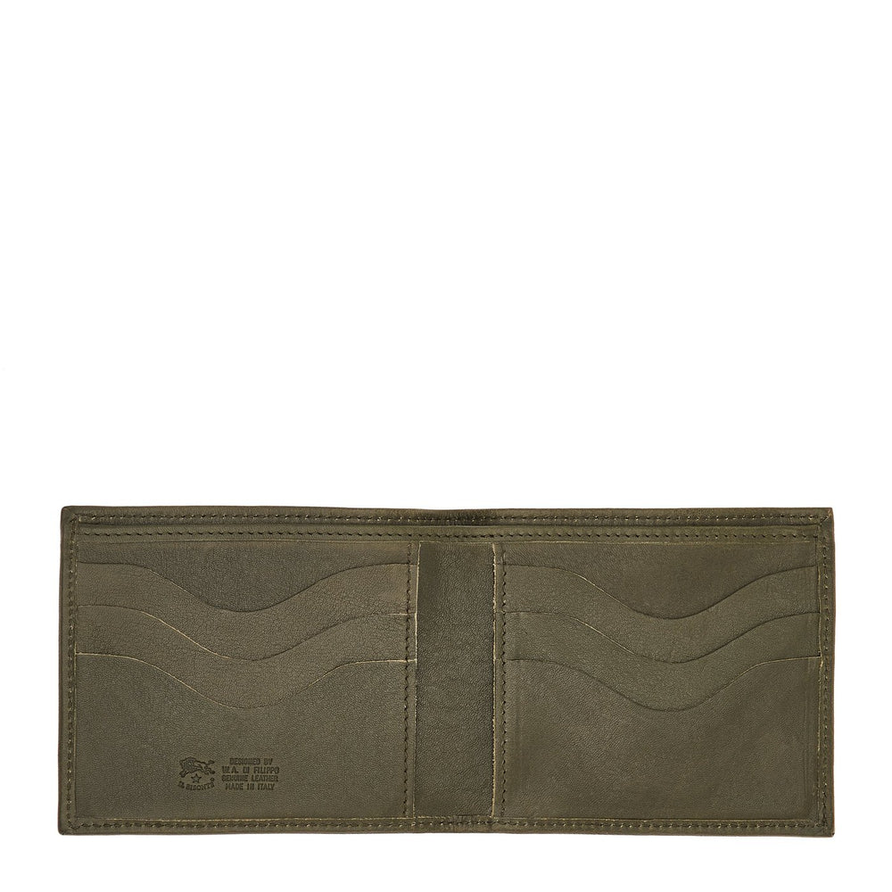 Portafoglio bifold da uomo in pelle di vacchetta conciata al vegetale con tasche per documenti, banconote e carte di credito. Prodotto in Italia dai maestri artigiani della filiera a km 30 de Il Bisonte. All'interno, scomparto sfoderato per banconote, 2 tasche porta documenti e 6 taschine porta carte di credito in pelle di vacchetta.