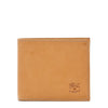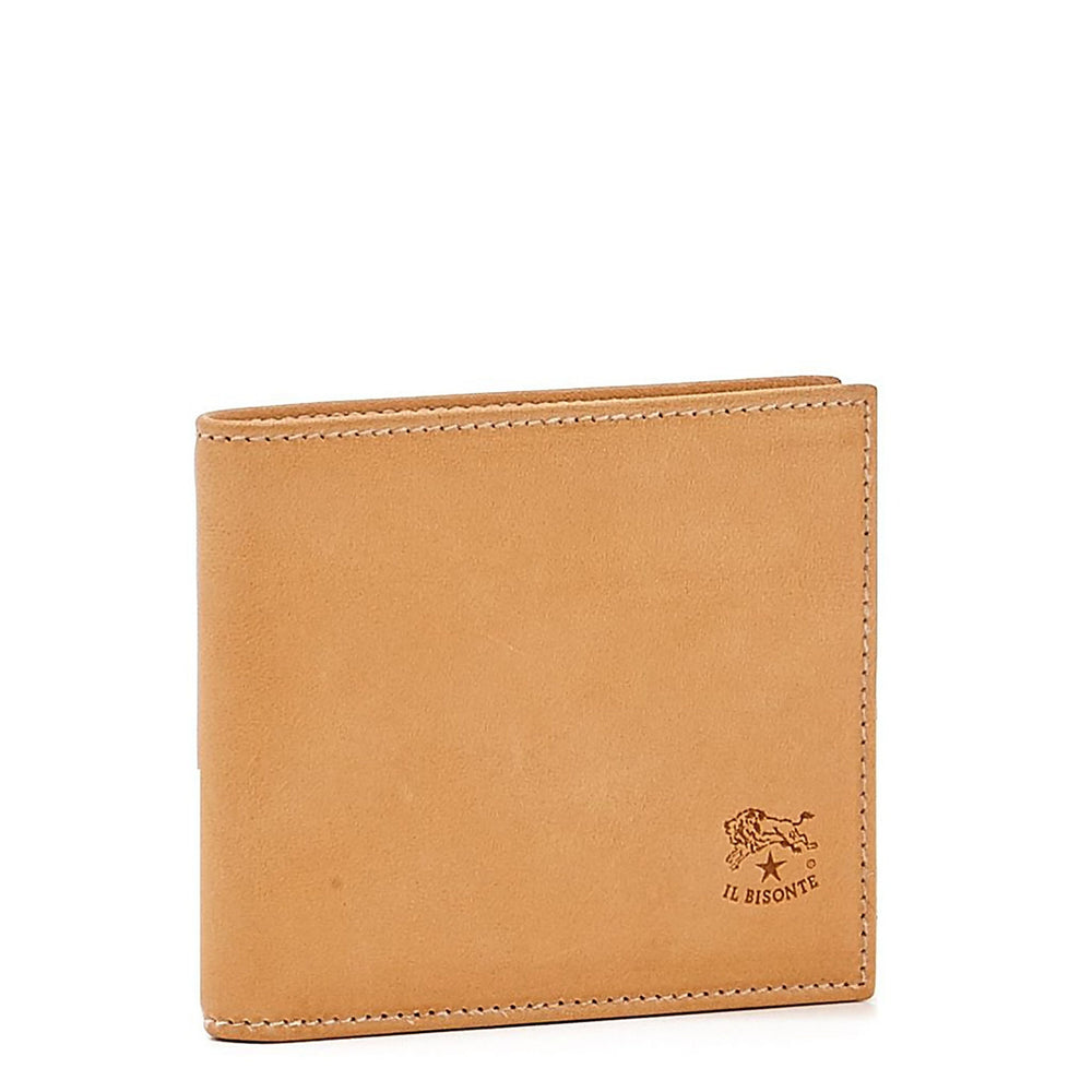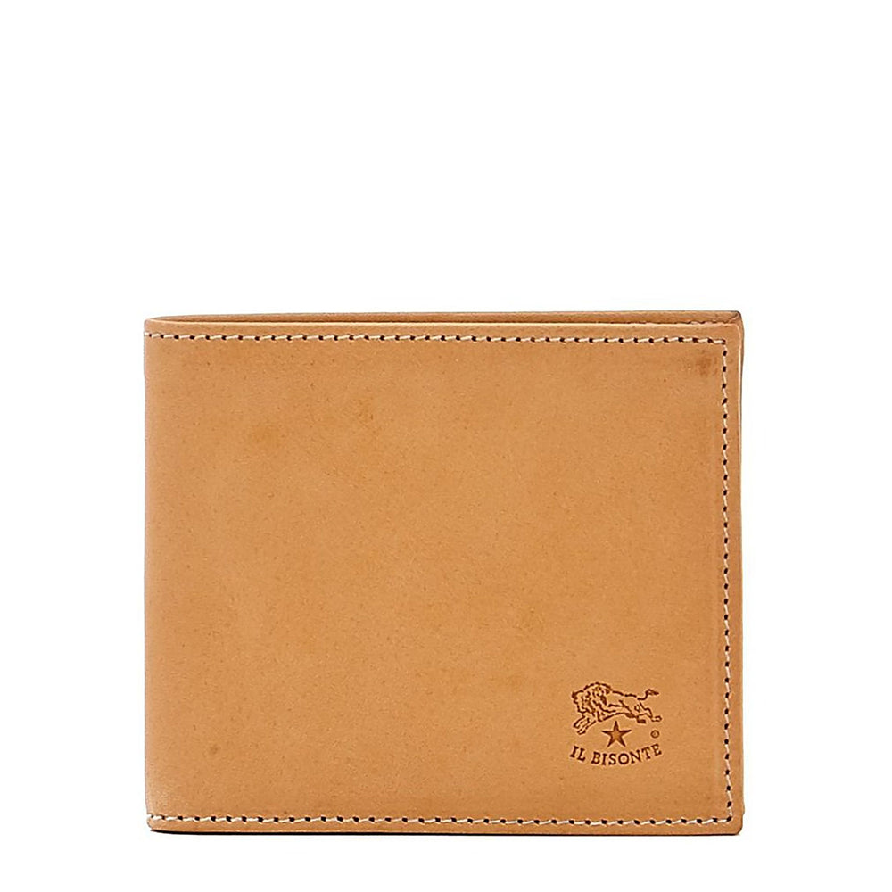 Portafoglio bifold da uomo in pelle di vacchetta conciata al vegetale, con tasche per banconote, carte di credito e documenti. Prodotto in Italia dai maestri artigiani della filiera a km 30 de Il Bisonte. All'interno, grande scomparto porta banconote sfoderato, 3 tasche porta carte e 1 tasca porta documenti in pelle di vacchetta con chiusura a bottone automatico a scomparsa.