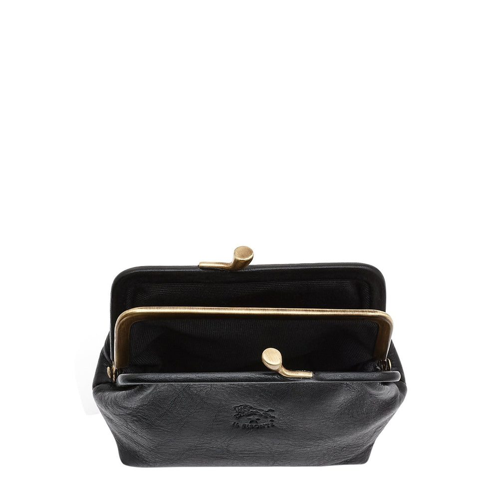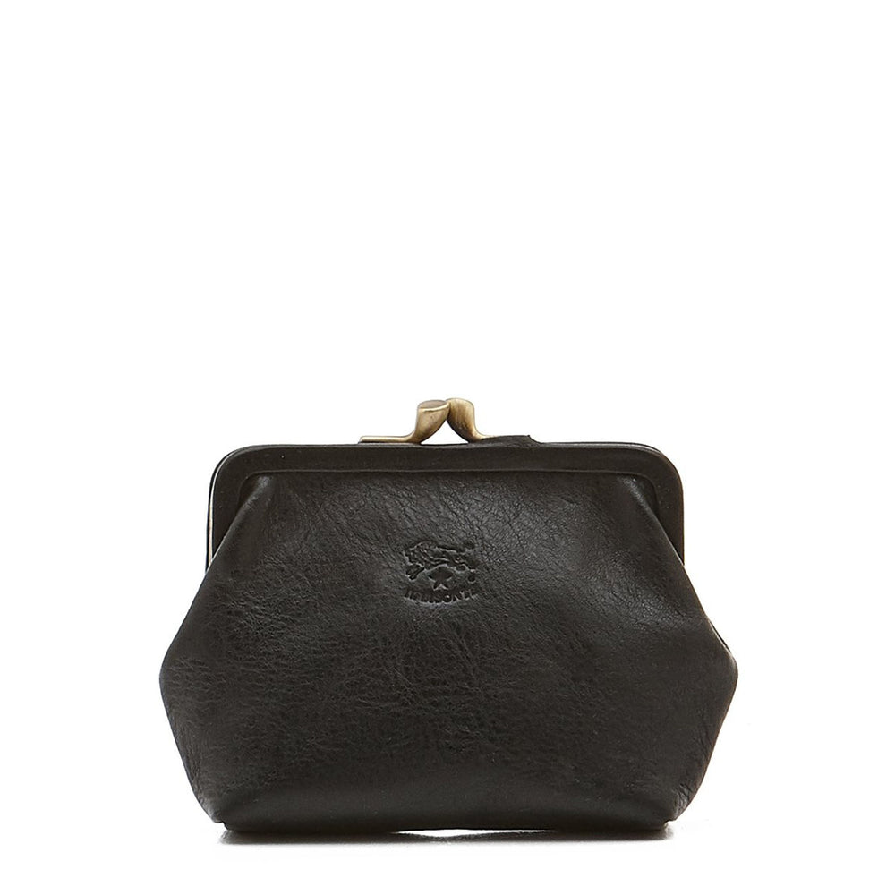 Portamonete da donna con chiusura a scatto dal design rétro. Realizzato in pelle di vacchetta conciata al vegetale, è prodotto in Italia dai maestri artigiani della filiera a km 30 de Il Bisonte. Chiusura e componenti metallici di ottone. L'interno, foderato in tela di cotone, è diviso in due scomparti.