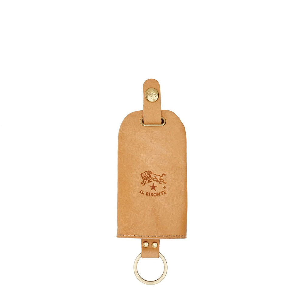 Portachiavi unisex a campana con anello di ottone e laccetto scorrevole. Realizzato in pelle di vacchetta conciata al vegetale e ottone, è prodotto in Italia dai maestri artigiani della filiera a km 30 de Il Bisonte. Bottone automatico di ottone. Interno sfoderato.